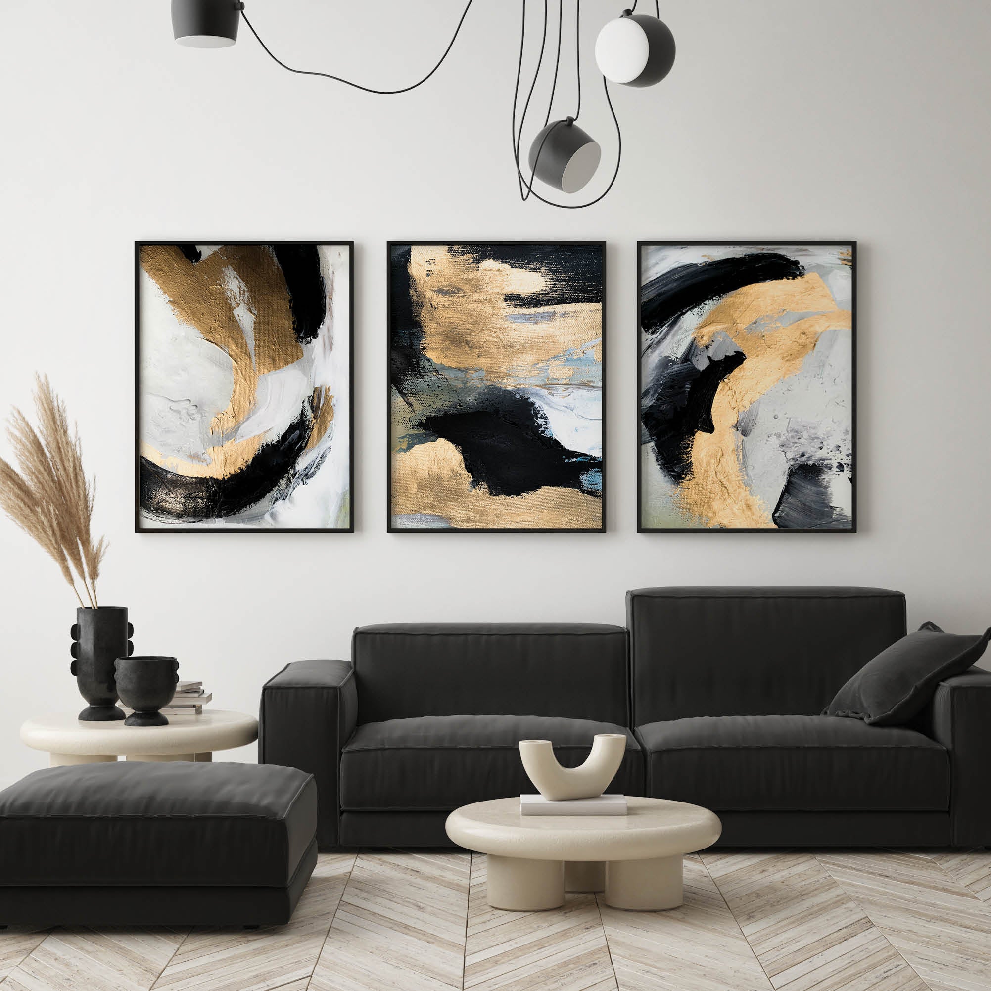 The “Abstract Storm” poster set presents three works of art that capture the essence of a stormy atmosphere and dynamic natural forces. With bold brush strokes and contrasting colors that clash and blend, these posters manage to convey a sense of energy and change. Golden shades add sparkle and luxury, while black and gray tones bring dramatic depth. This collection fits perfectly into modern spaces that strive for art that attracts attention and sparks conversation, while at the same time perfectly fitting the palette of current trends in interior design. “Abstract Storm” posters are created for art lovers looking for works with strong visual expression that will enrich and refresh their home or work space.