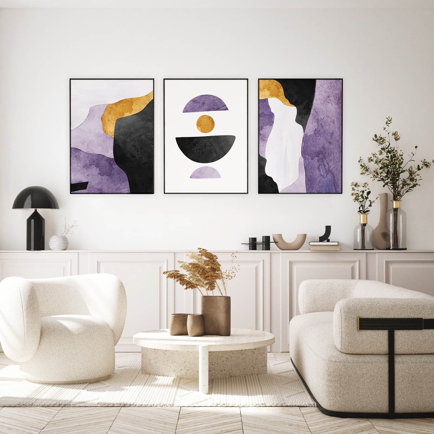 The “Purple Haze” set presents a trio of artworks that reflect the depth and complexity of purple combined with black and gold tones, providing a visual representation of elegance and contemporary design. Each poster in the collection offers a unique perspective on the interplay of color and form, creating layered and intriguing compositions.