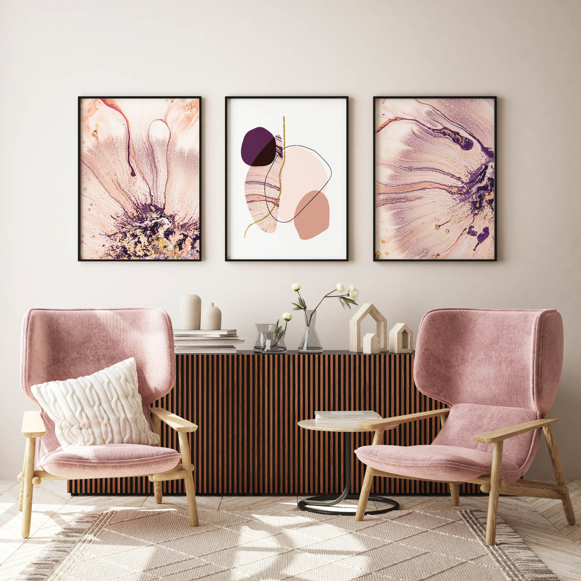 The “Spectacular Marble Warm” poster set brings sophisticated elegance to any space. This artistic trio combines soft pastel tones with bold plum accents and gold hues, resulting in a balanced blend of classic beauty and contemporary design. The left image reminds us of the playfulness of natural stone with its fluid lines and explosion of golden pigment. The central poster with its abstract shapes and lines invites introspection, while the right poster with fluid marble patterns closes the composition into a harmonious whole. These posters are an excellent choice for those who appreciate art and want to bring elements of luxury and warmth into their home. They are an ideal addition to a modern, minimalist or classically decorated interior, adding a sophisticated touch and visual interest.