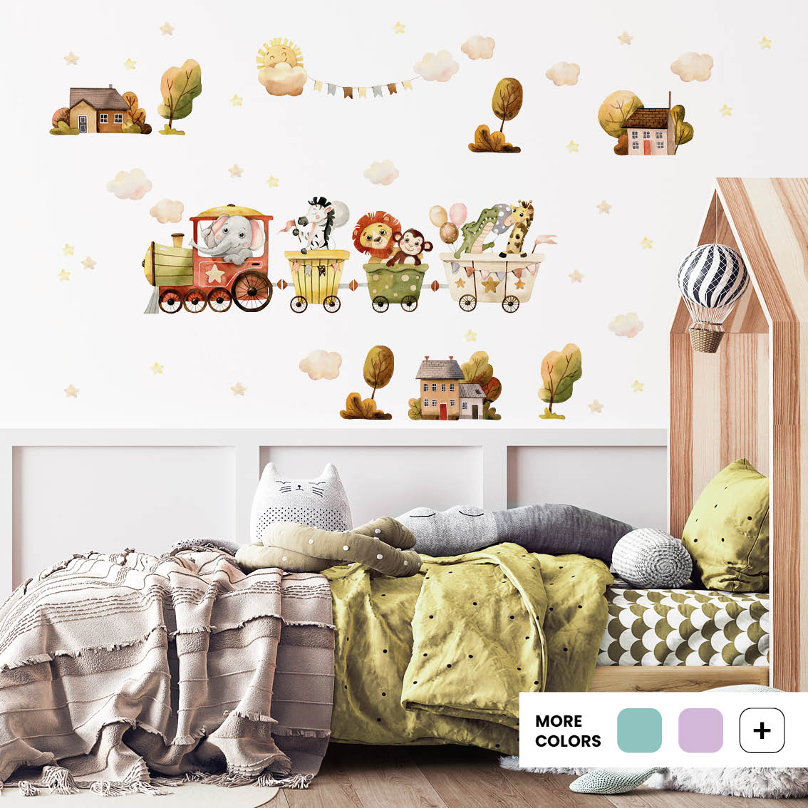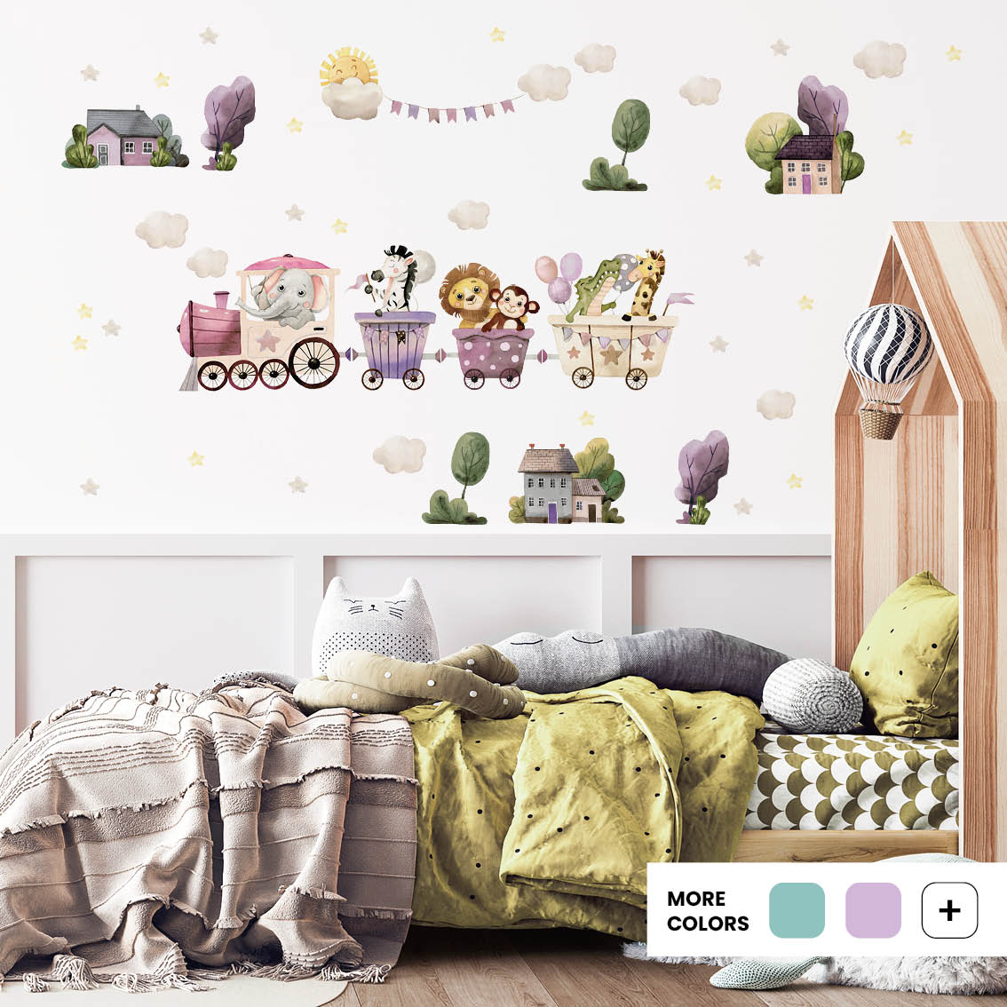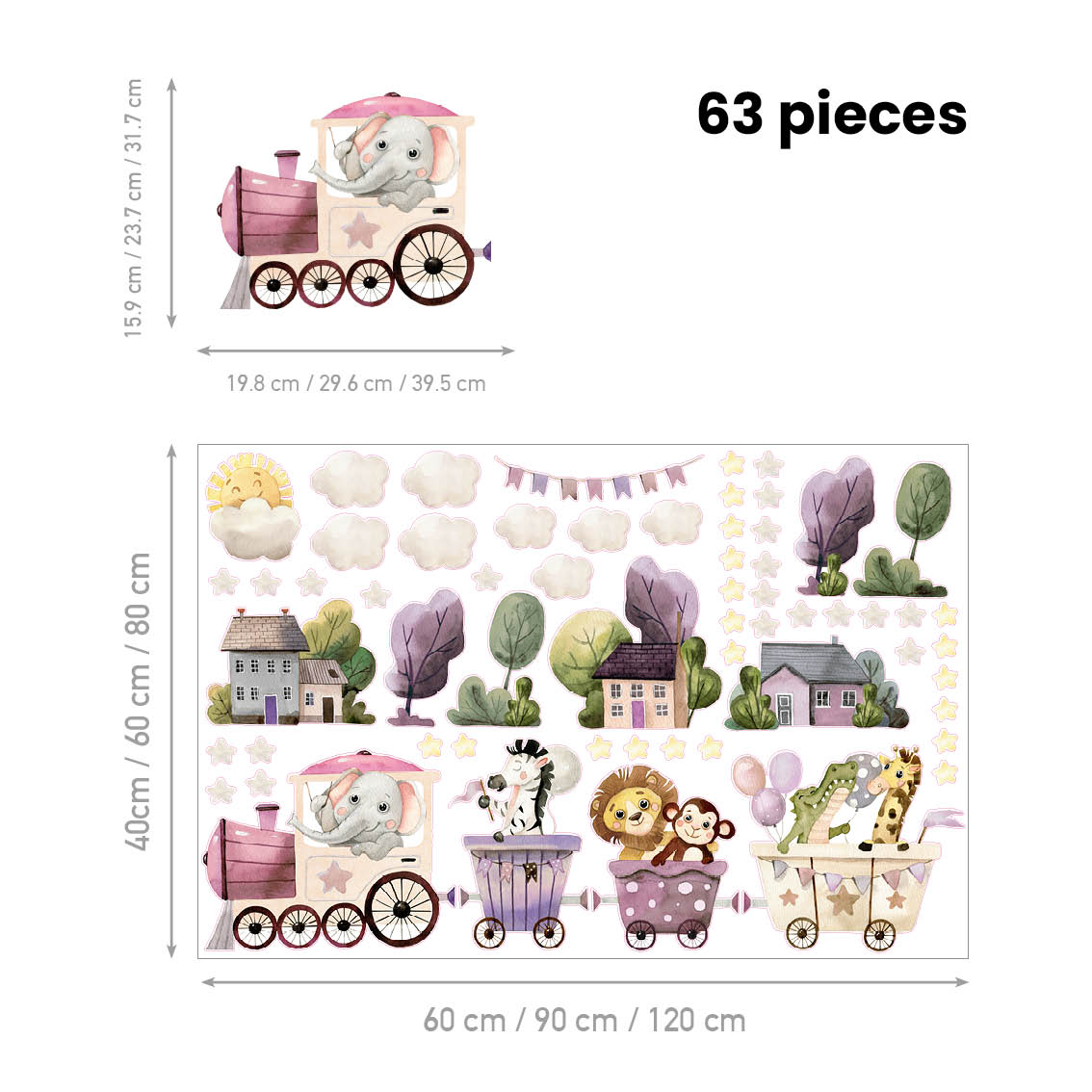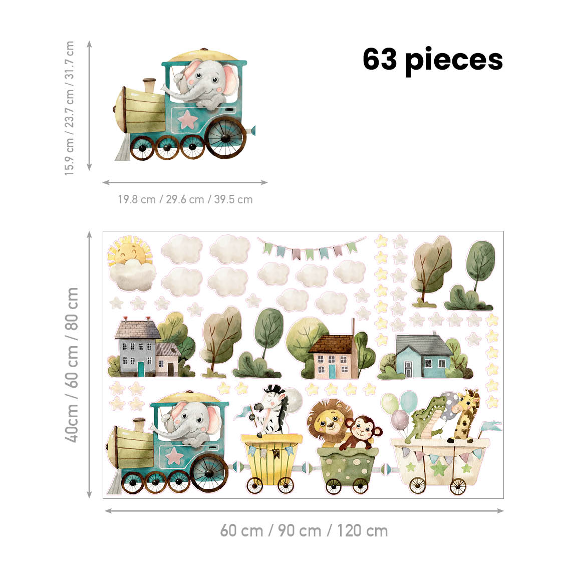 Add fun with carnival train decals in cheerful colours. Textile material is safe, removable, and styled easily for nurseries.