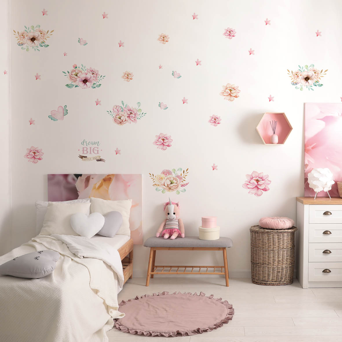 Create a dreamy atmosphere with Children’s Wall Stickers Dream Big Bouquets. Gentle details and soft colors bring calm, comfort and a sense of wonder to the room. It turns interiors into magical spaces full of creativity and beauty.