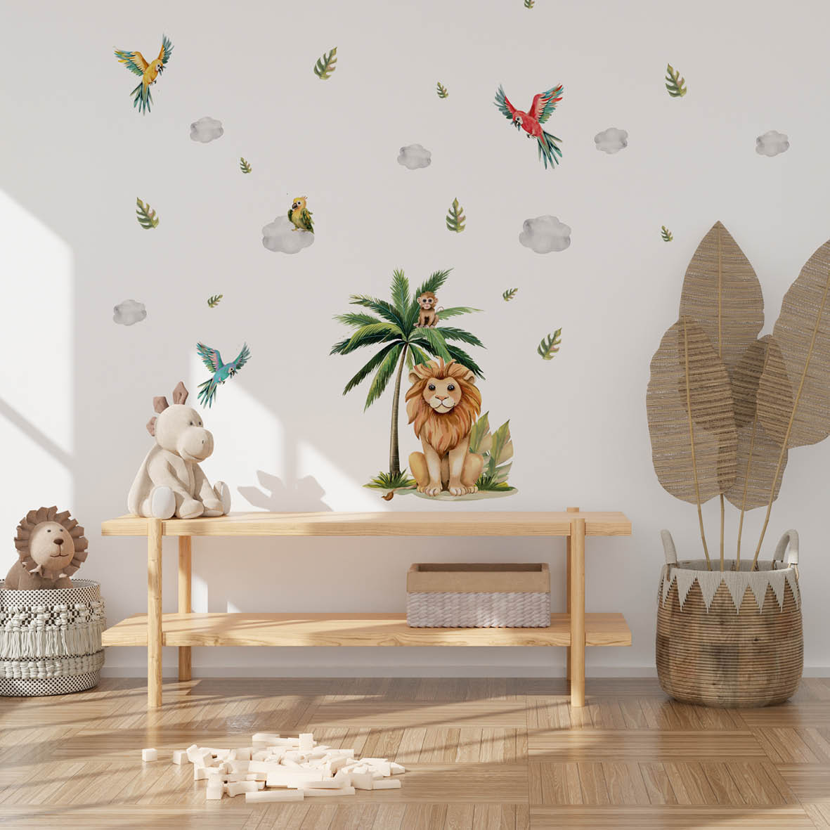 Fill nurseries with colourful lions using safari adventure decals. Premium textile stickers are repositionable, safe for walls, and simple to apply.