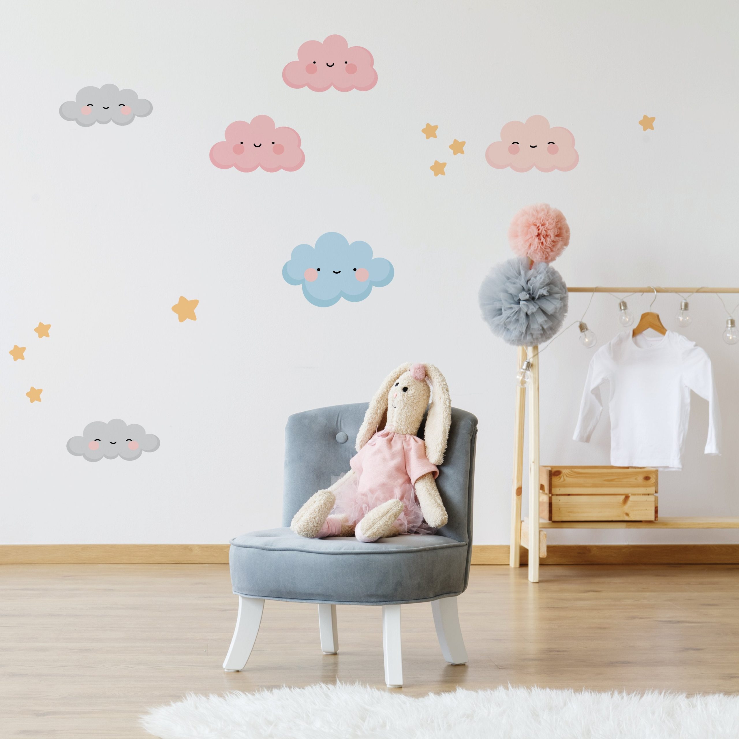 Add calm with clouds family wall decals in gentle designs. Textile material is safe, removable, and styled easily for nurseries.