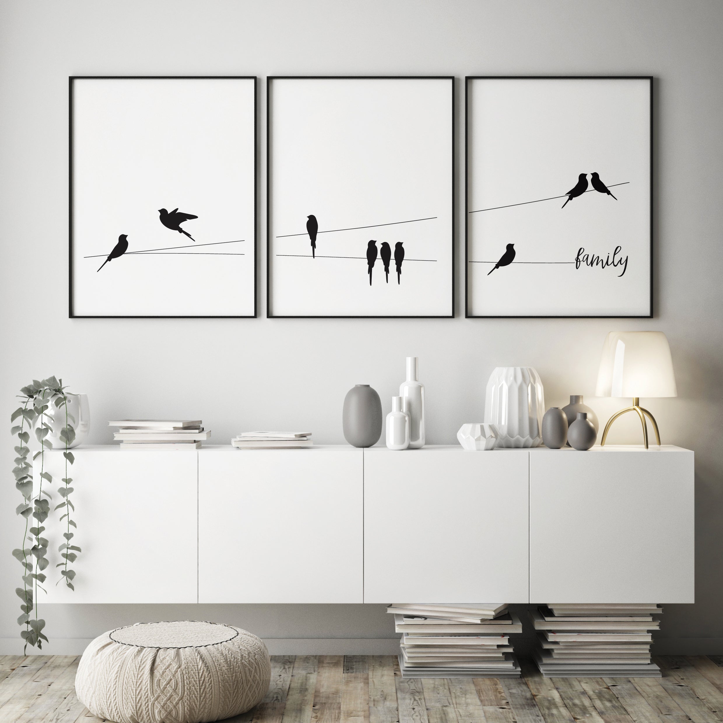 The poster set “Bird Family” is characterized by a clean and minimalist design, and emphasizes the warmth and connection that a family brings. Each picture symbolizes a unique moment in family life, depicting birds resting peacefully on a wire, symbolizing the power of togetherness and harmony. Gentle silhouettes are interwoven with a strong message about the importance of family ties and closeness. This three-piece set is ideal for creating a calming atmosphere in your home, providing a sense of comfort and tranquility that comes with the presence of loved ones. The white background with black contrasting lines allows these posters to easily blend into different decorative styles, while the word “family” on the last poster quietly but powerfully emphasizes the message of the whole set.