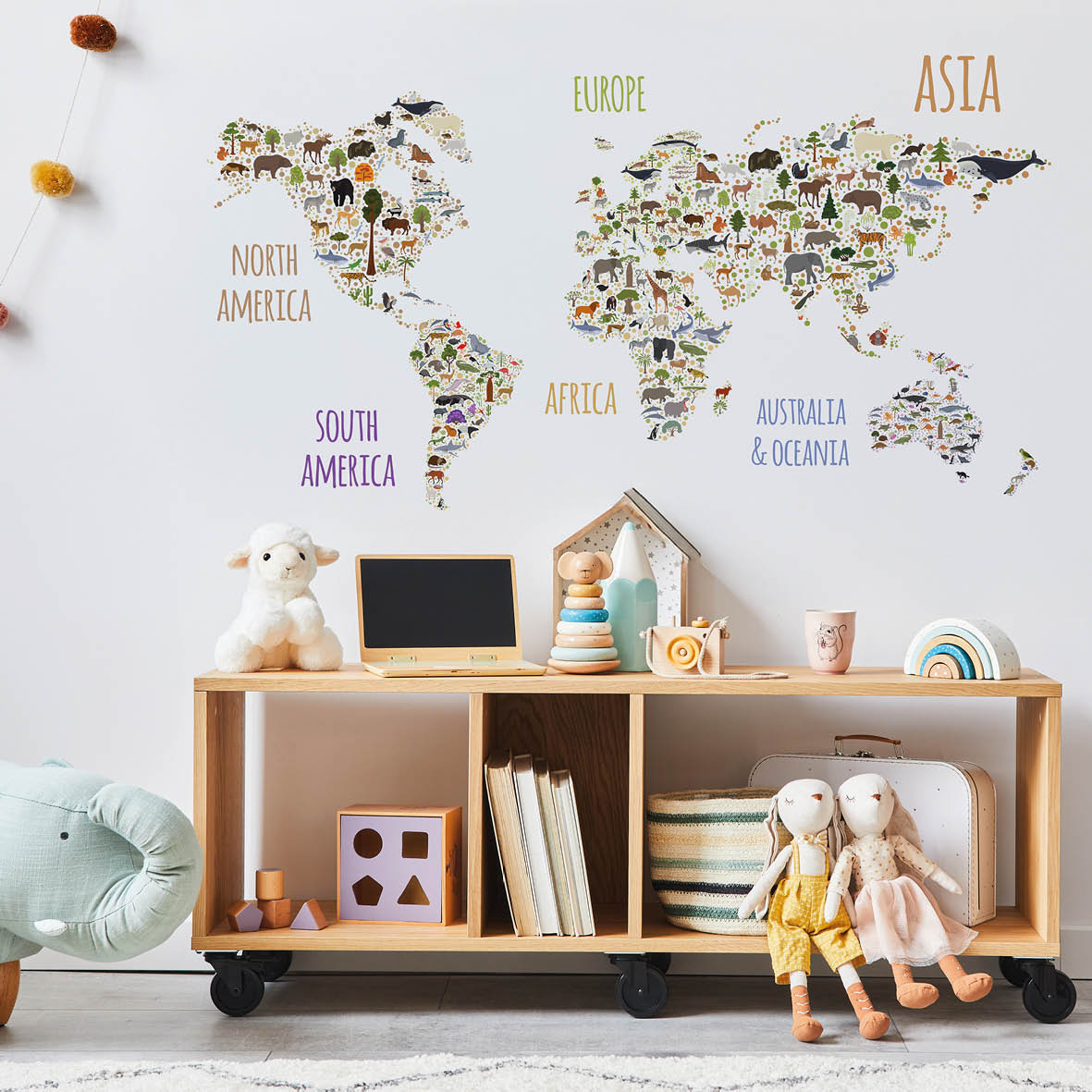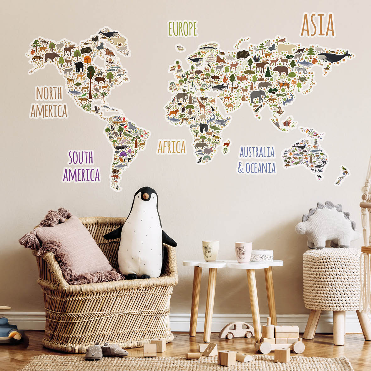 Fill nurseries with animals and continents using world map decals. Premium textile wall stickers are gentle, removable, and simple to arrange.