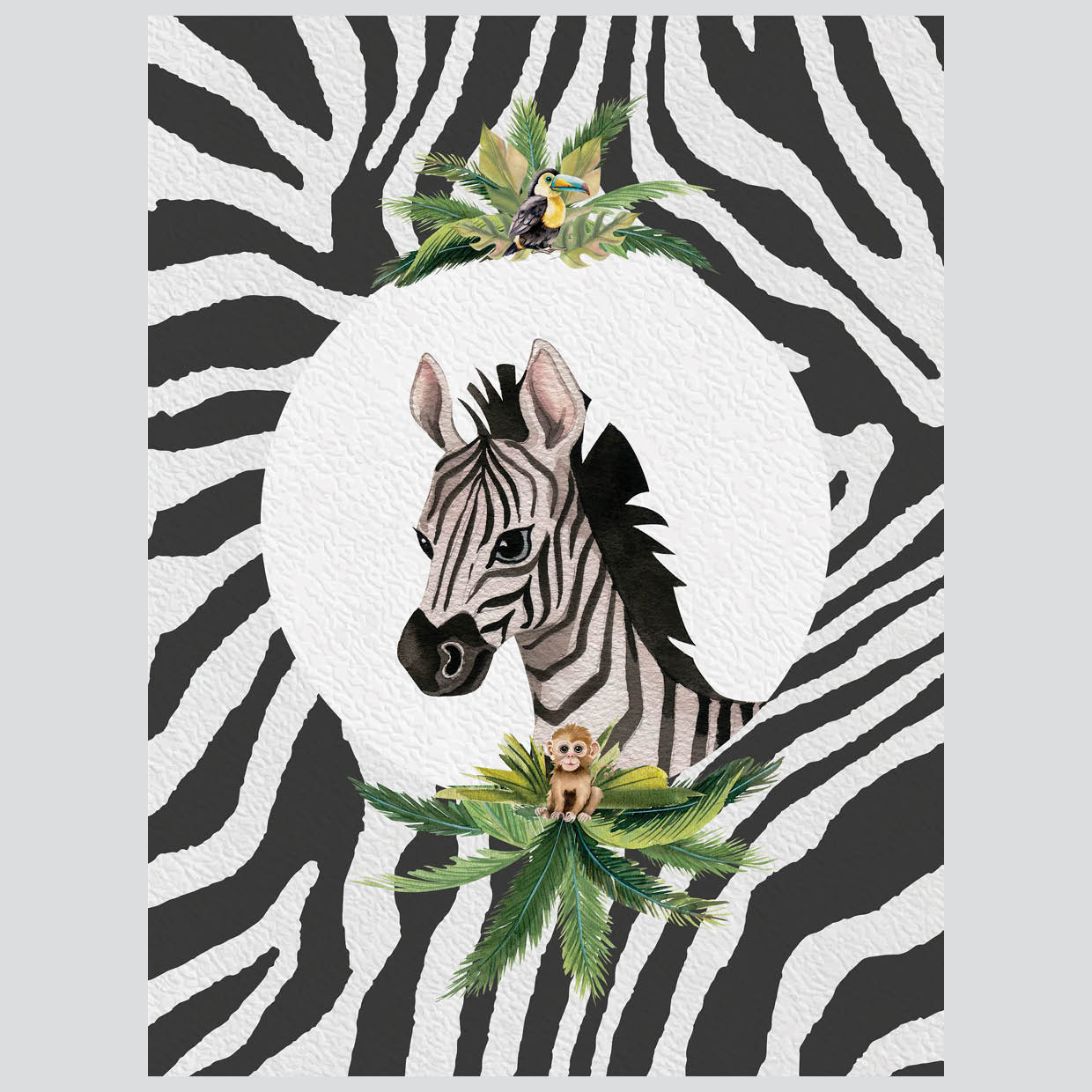 Elegant zebra artwork introduces safari charm with clean stripes and gentle contrast. Educational yet stylish prints group neatly for a curated gallery wall that grows with your child.