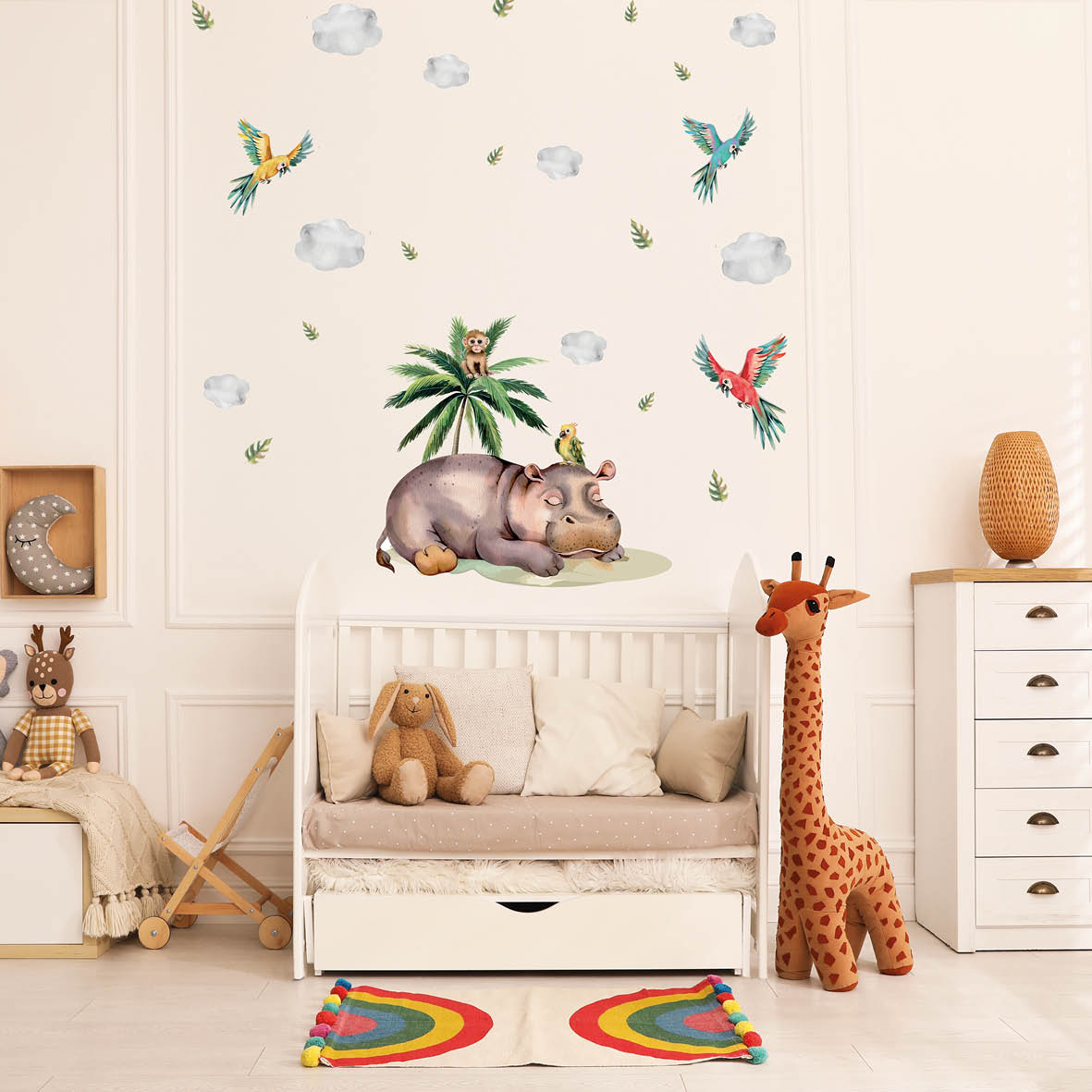 Turn blank walls into cheerful safari scenes with hippo decals. Made from premium textile, repositionable, safe, and durable for kids’ rooms.