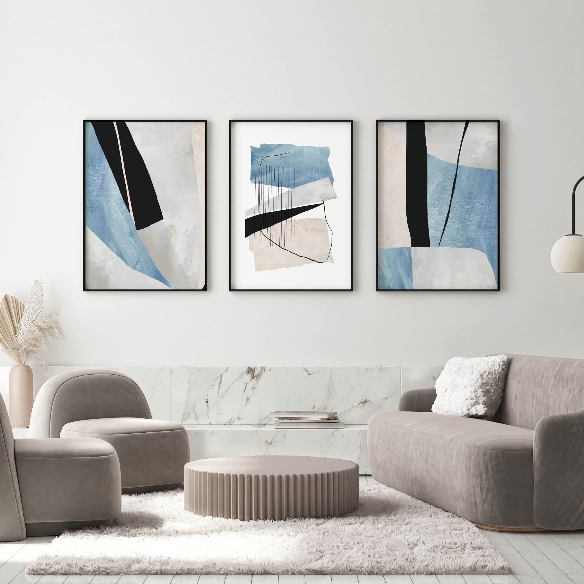 The “Whispering Zen” poster set is characterized by subtle elegance and a minimalist approach that soothes and attracts the eye of the beholder. This collection of three paintings explores balance, texture and composition through the use of soft blues and neutral tones with accentuated black lines that add definition and depth to the work.