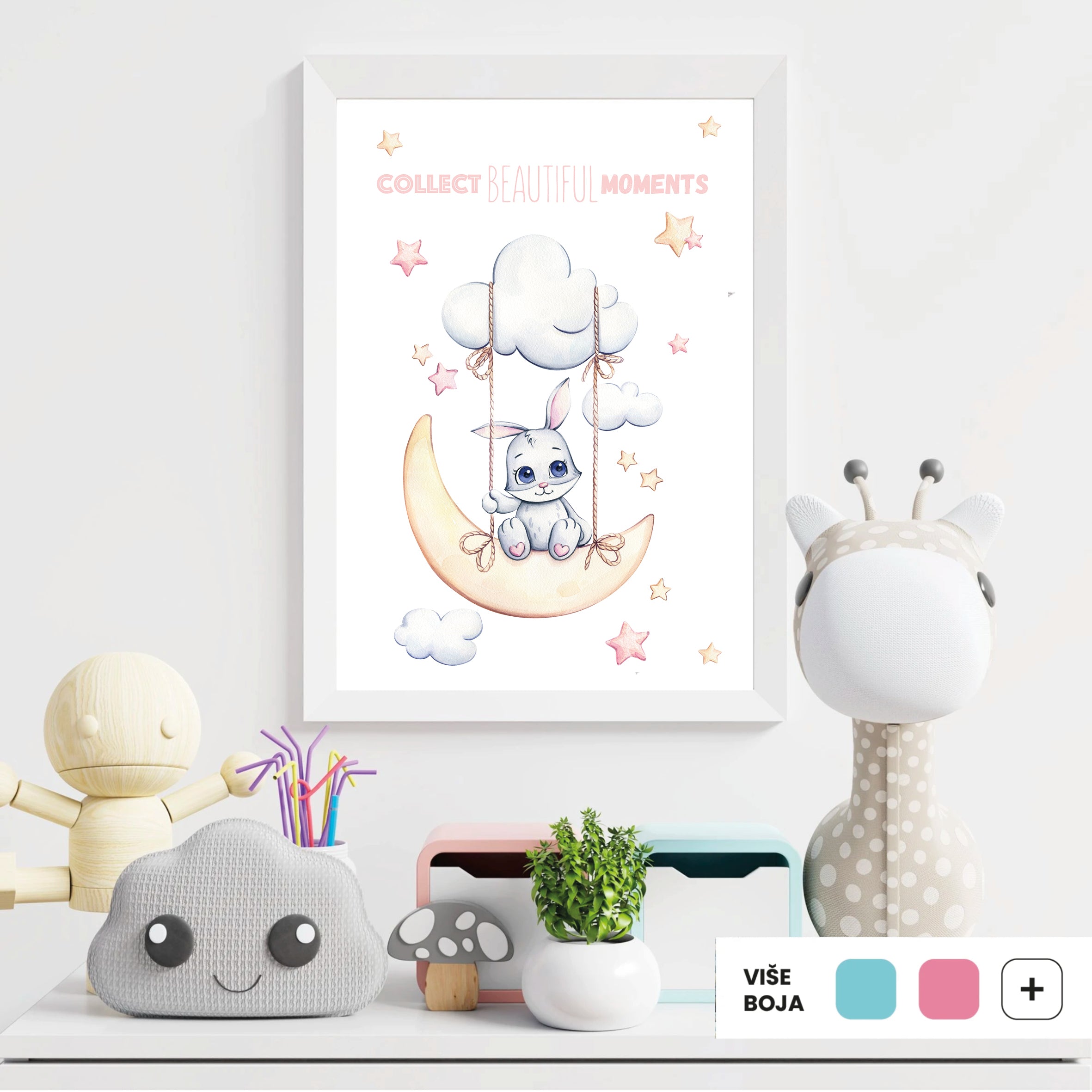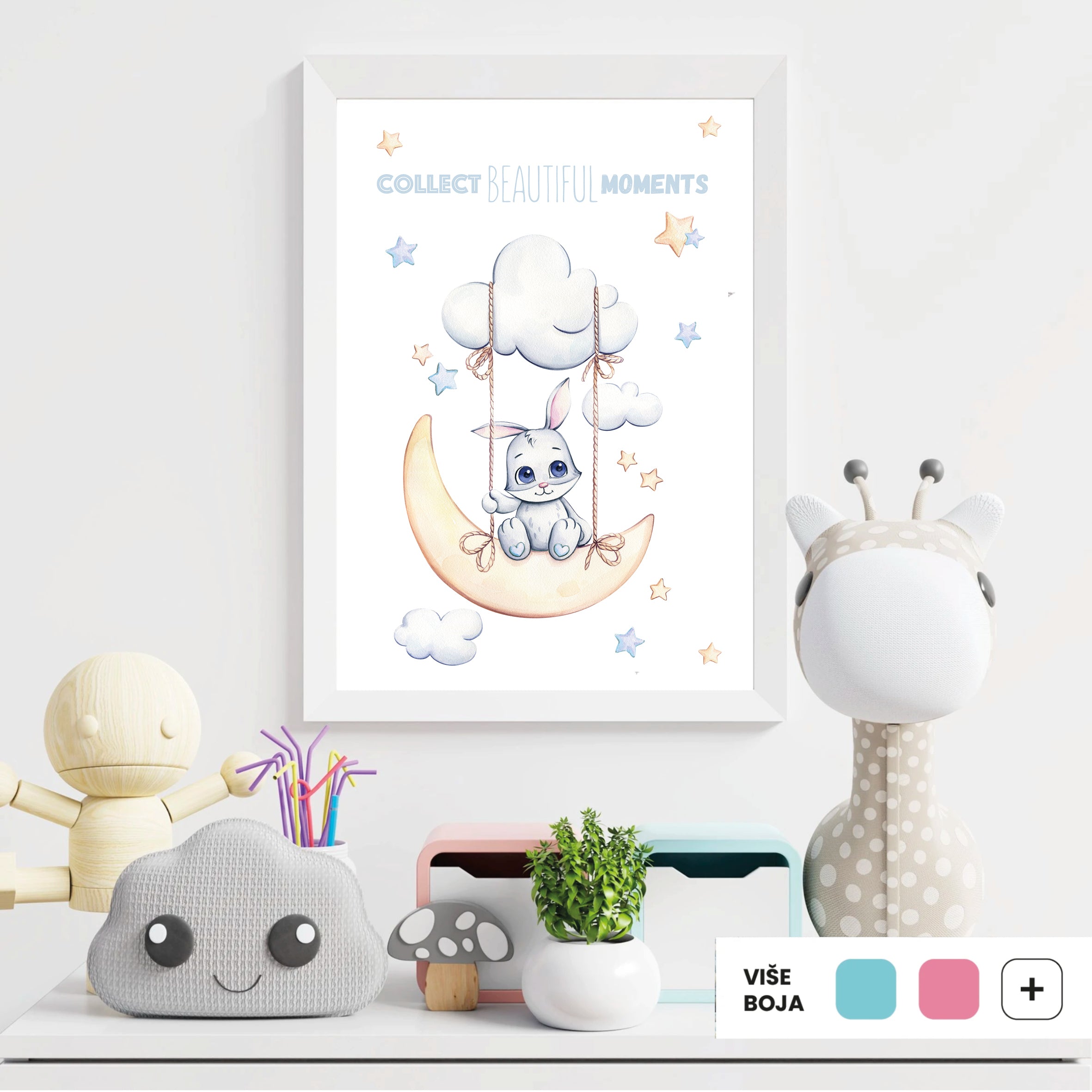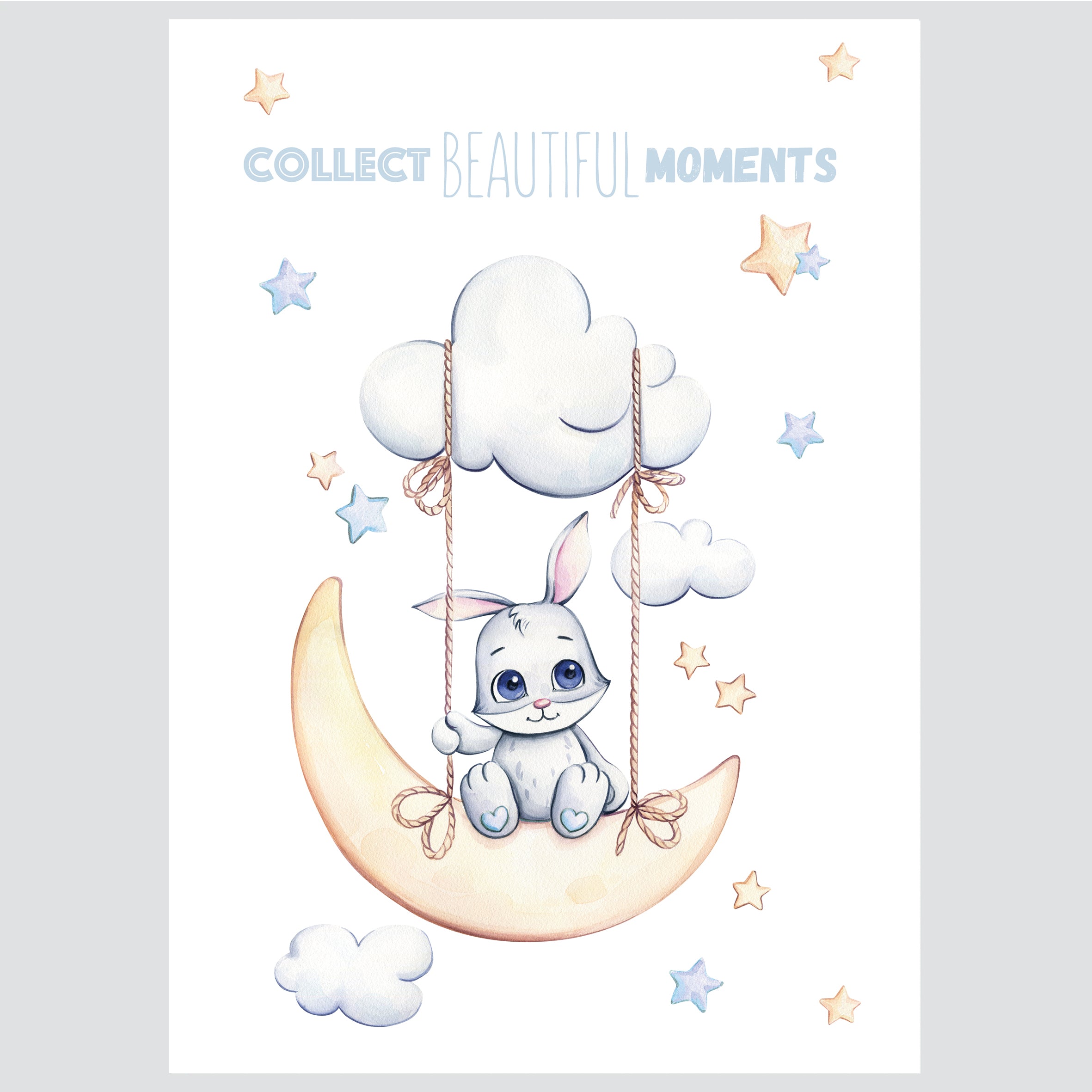 In this cuddly illustration, the moon is the home of an imaginative little rabbit swinging high among the clouds. His look, full of joy and innocence, seems to tell us about the carefree days of children when everything is possible, and imagination takes you far. The stars and soft clouds that surround our little hero provide a feeling of warmth and security, as well as the endless possibilities that the night sky brings.