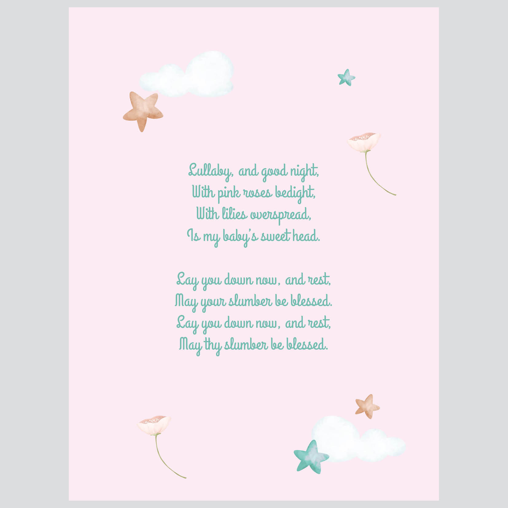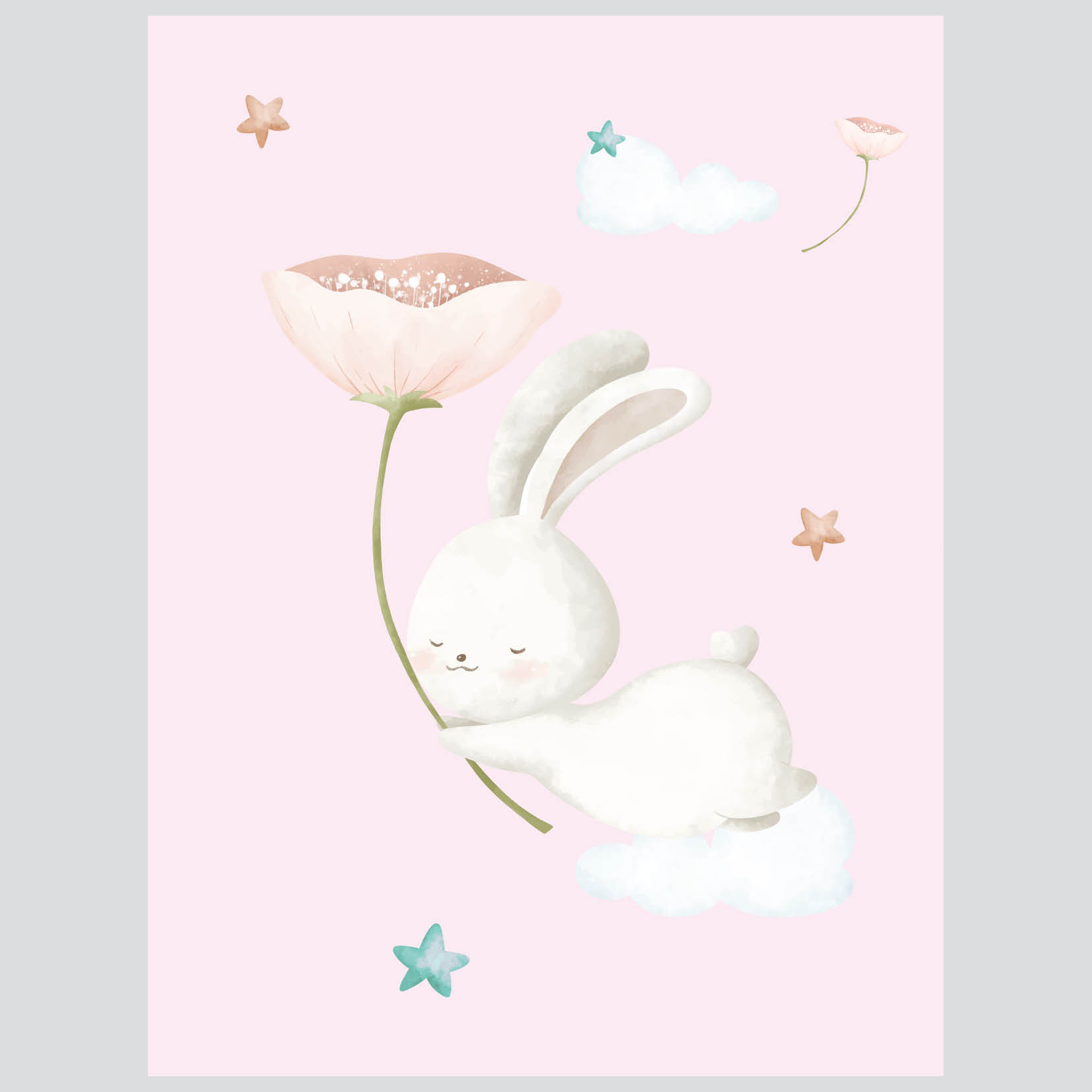 Magical rabbit scenes in pink tones add warmth and comfort before sleep. Matte prints group neatly to form a tender, balanced gallery wall.
