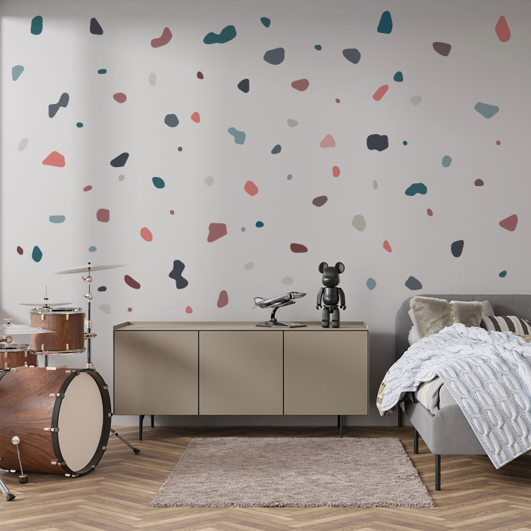 The Terrazzo Funky Pebble wall sticker brings a colorful, playful approach to the classic terrazzo pattern. Ideal for those who love colors, dynamics and fun elements in their interior, this sticker gives the space personality and energy. Each “stone” in this pattern tells its own story through different shapes and shades.