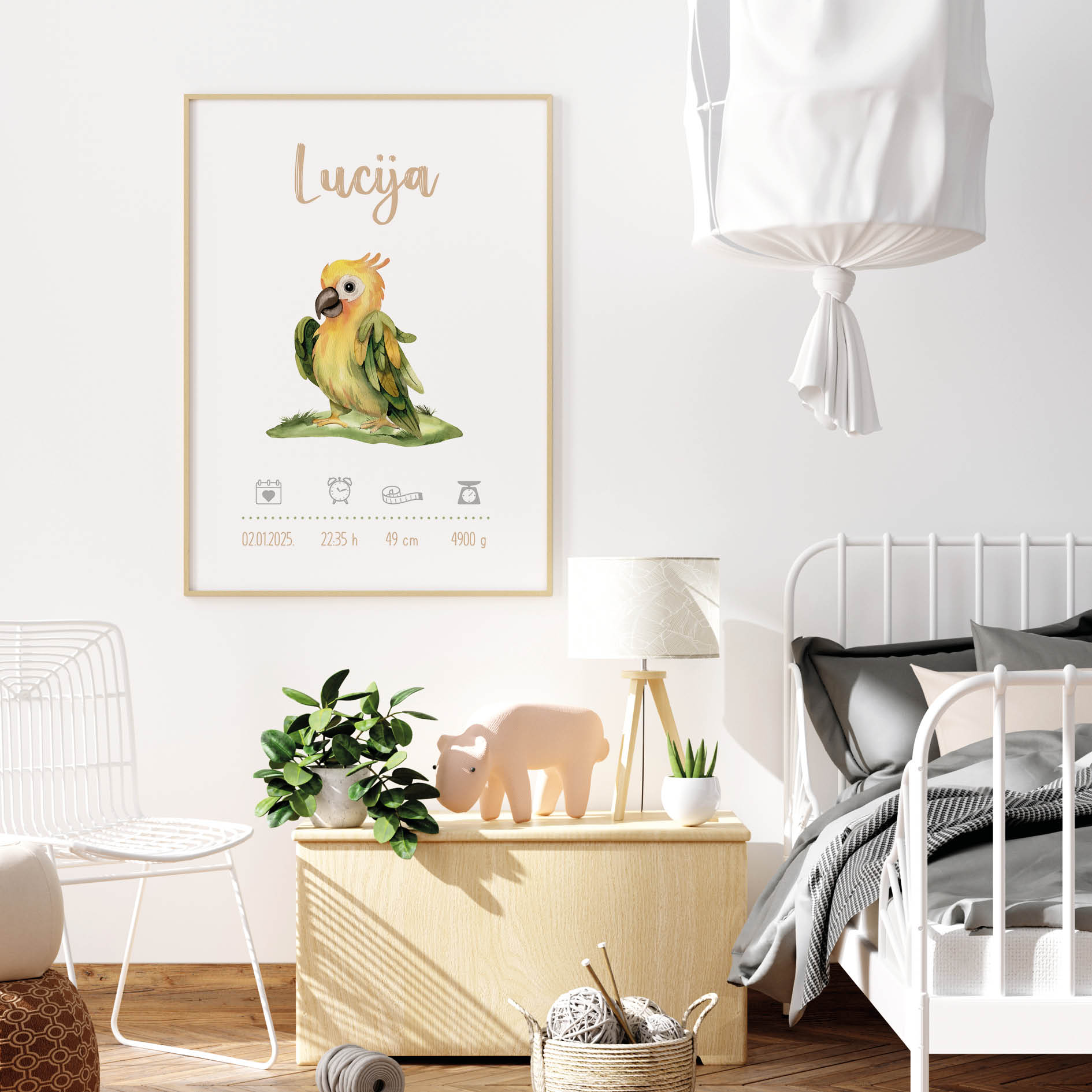 Personalised kids poster parrot UAE fills children’s rooms with tropical colour and playful charm. The cheerful parrot, painted in delicate watercolours, brings brightness and energy to nursery walls. Its vibrant feathers inspire curiosity and imagination, turning everyday moments into joyful adventures.