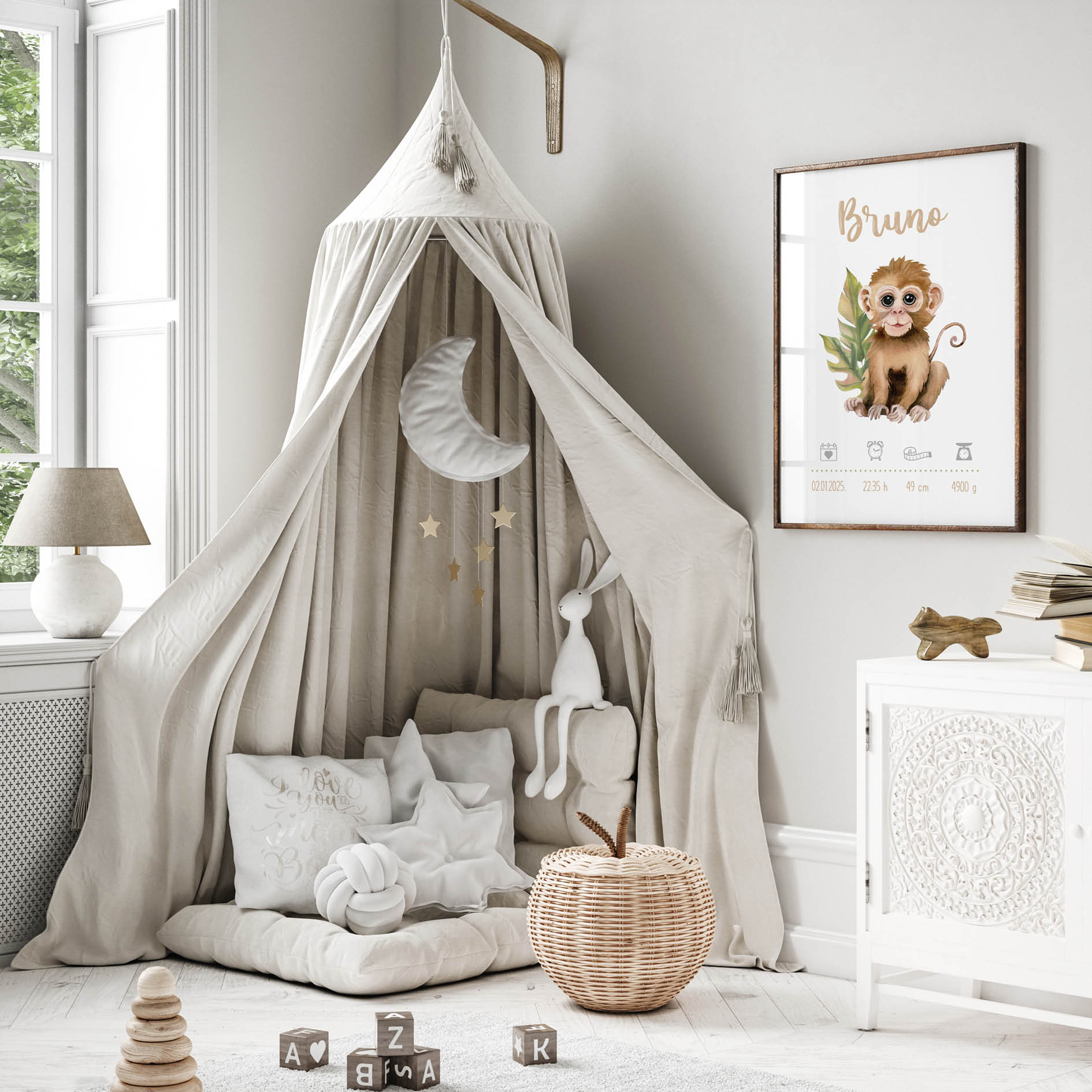 Personalised safari poster monkey UAE brings joy and playfulness into children’s rooms. The cheerful monkey, painted in gentle watercolours, swings with energy and charm, turning nursery walls into lively storytelling spaces. Its fun expression sparks imagination, laughter, and endless adventures every day.