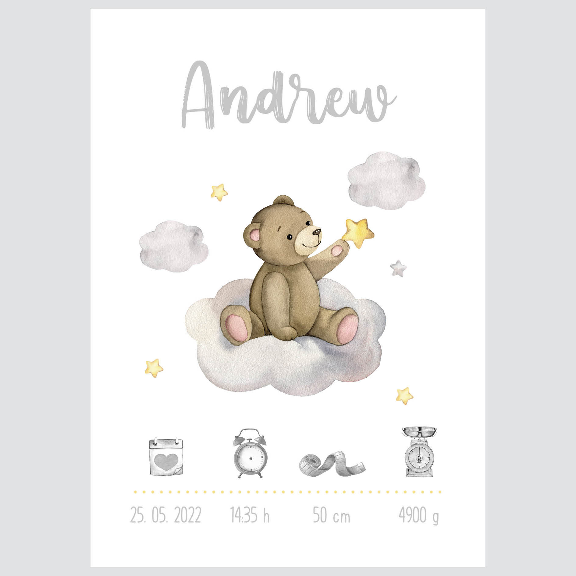 Personalised teddy bear poster cloud UAE brings dreamy softness and gentle imagination into children’s rooms. A sweet teddy rests on a fluffy cloud painted in delicate watercolours, floating across the sky with grace. It transforms nursery walls into storytelling scenes that inspire calm, play, and wonder.