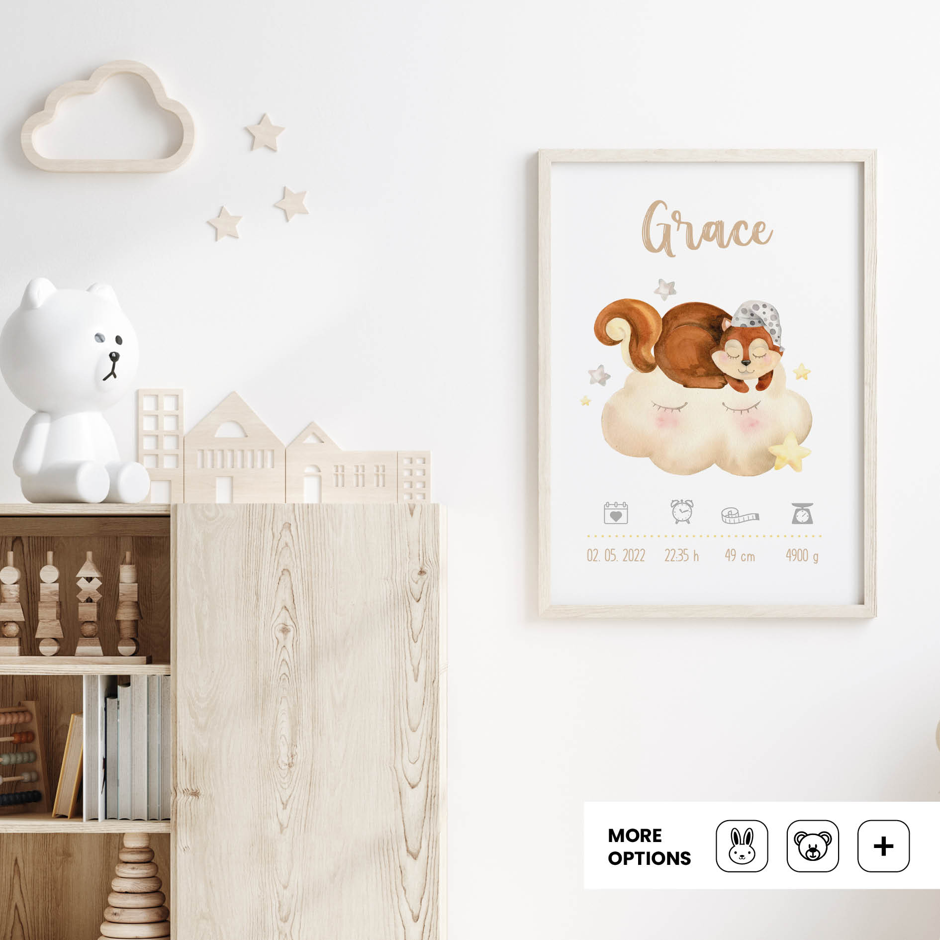 Personalisation makes the Dreaming Squirrel poster truly unique. Adding your child’s name into the woodland design creates pride, joy, and a sense of belonging. More than decoration, it becomes a keepsake woven into family life – from playful afternoons to bedtime rituals filled with love and imagination.