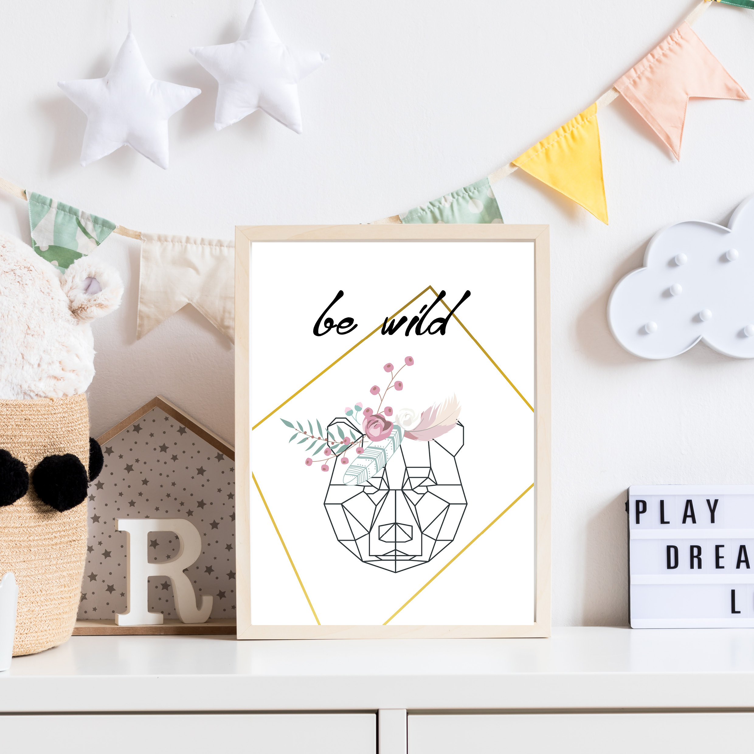 The message “Be Wild”, which translates as “Be wild”, is written in the upper part of the illustration in a free and fluid stroke, which reflects freedom, instinct and indomitable energy. The golden geometric shape that surrounds the entire composition gives this art a subtle frame, bringing an element of luxury and stylization into it.
