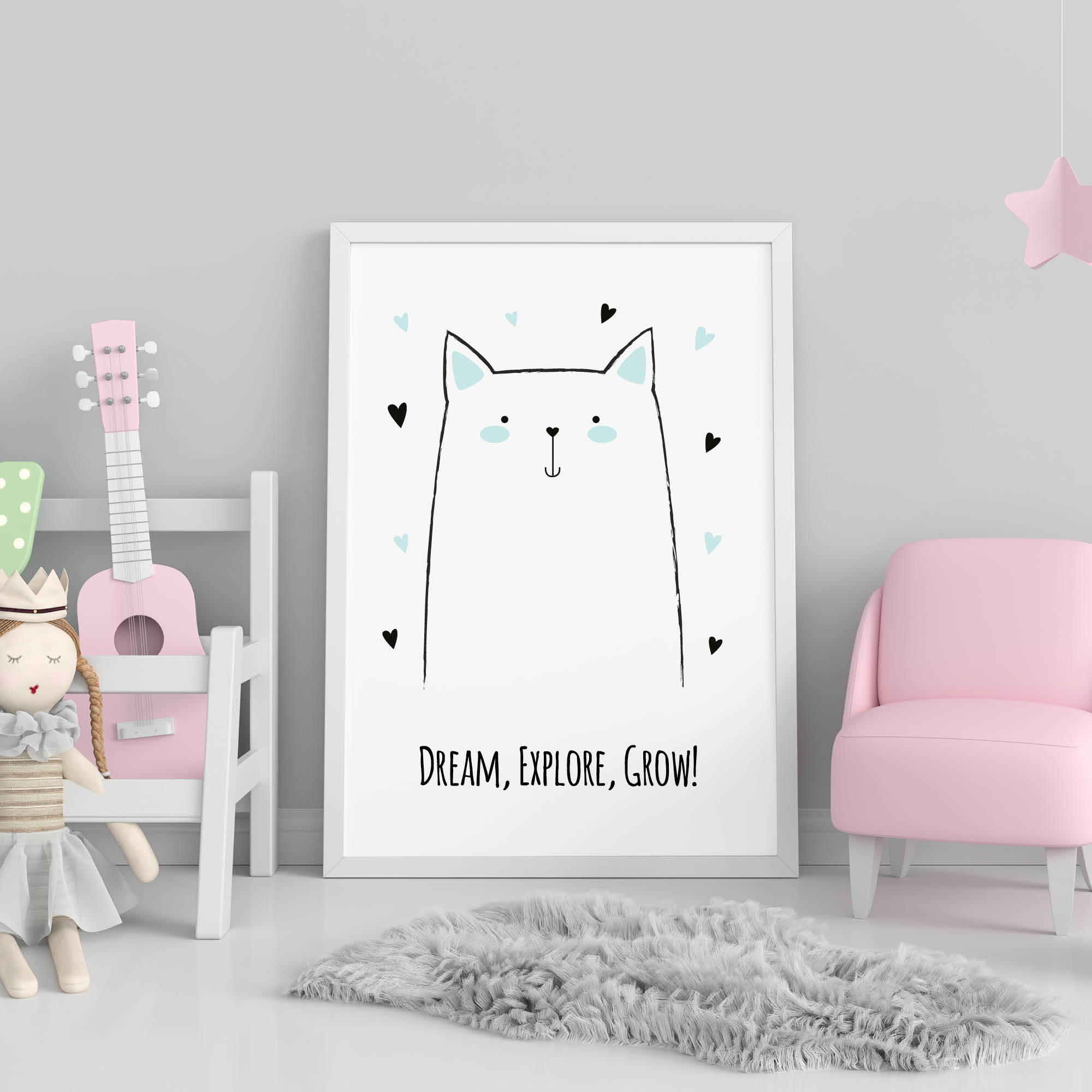 Placing this sweet and motivating illustration in a child’s room provides a daily reminder that life is an adventure full of discovery. It is not only a decoration, but also an inspirational message that supports the idea of the importance of dreams and research as a foundation for growth and learning.