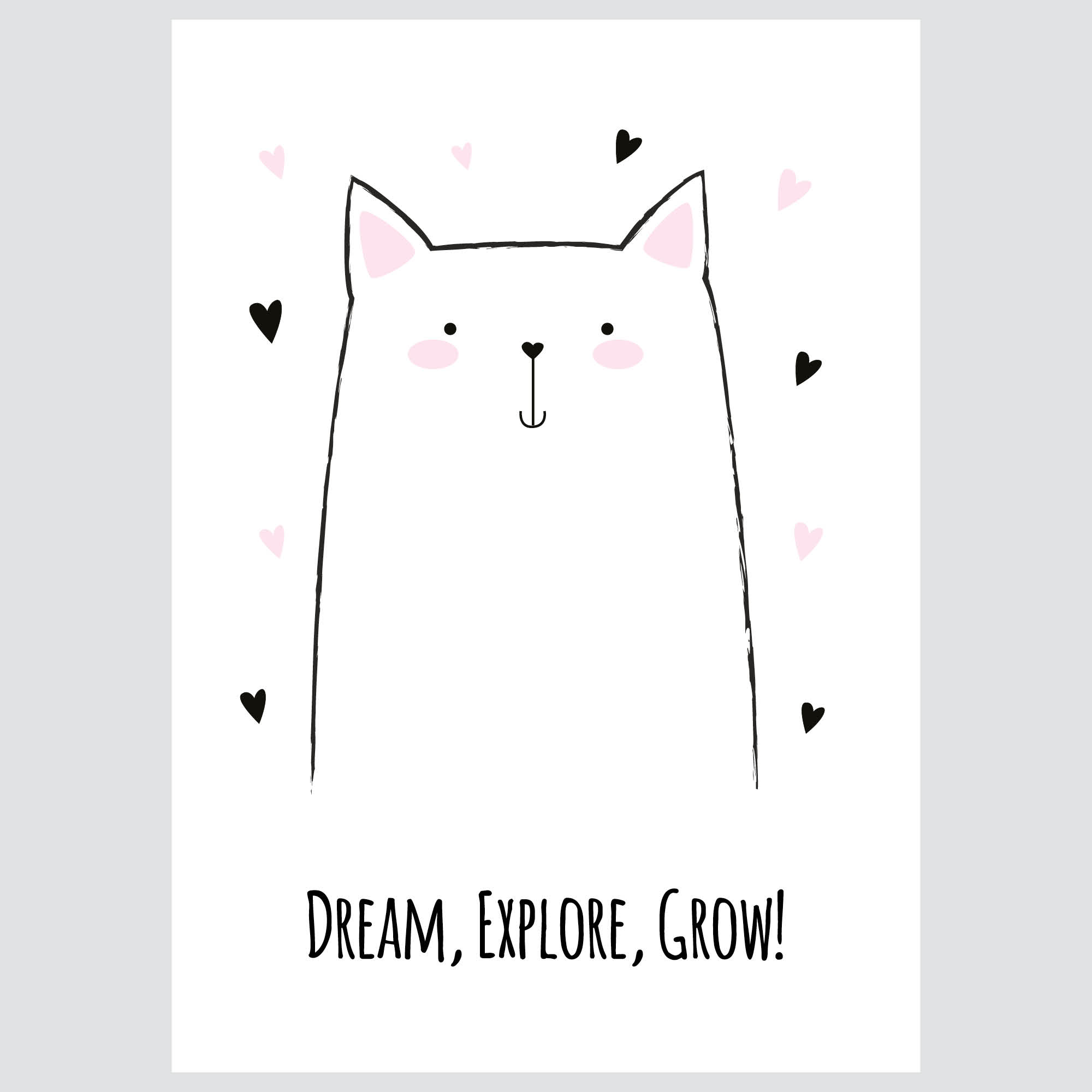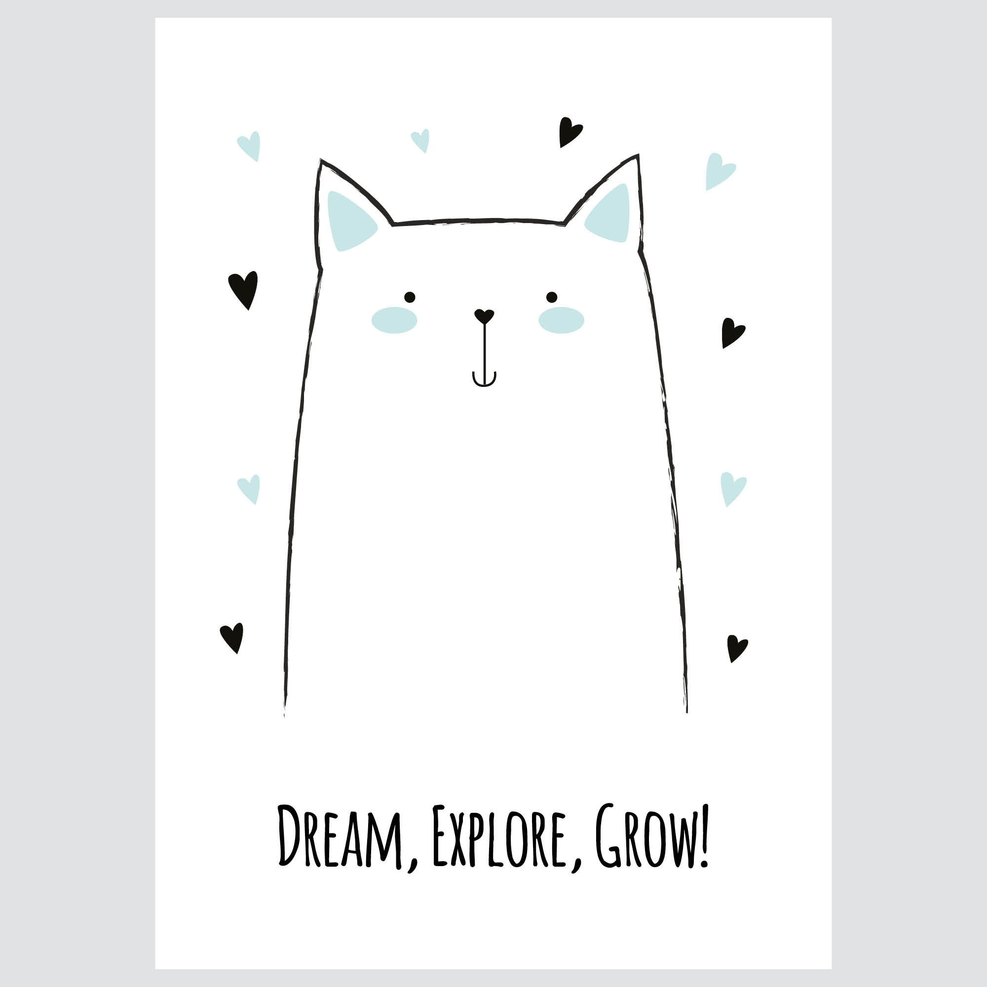 Text “Dream, explore, grow!” is the message that accompanies the illustration, encouraging little observers to strive for personal development and self-knowledge. She encourages children to walk boldly through life, guided by their dreams, curiosity and desire to grow.