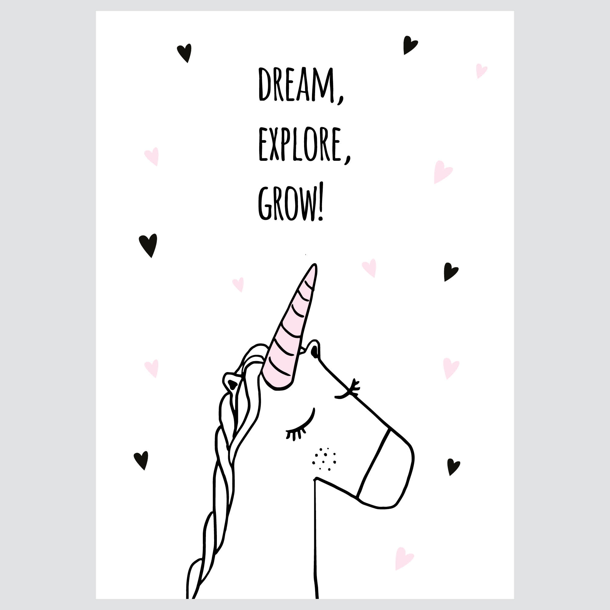 The illustration “Dream, Explore, Grow” shows the figure of a unicorn radiating peace and friendly energy, surrounded by hearts floating like thoughts or dreams. The unicorn’s eyes are half-closed in a contented expression, and a gentle smile on its face suggests contemplative happiness.