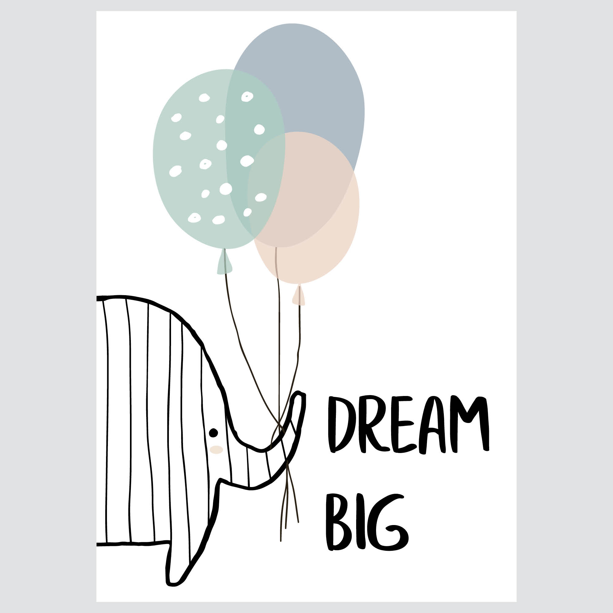 The illustration “Elephant” spreads the message of courage and inspiration through a simple but touching depiction of an elephant holding balloons. The soft pastel tones of the balloons floating above this friendly giant create a feeling of lightness and hope. The message “Dream Big” is elegantly placed alongside the illustration, encouraging viewers, regardless of their age, to dare to dream and set big goals.