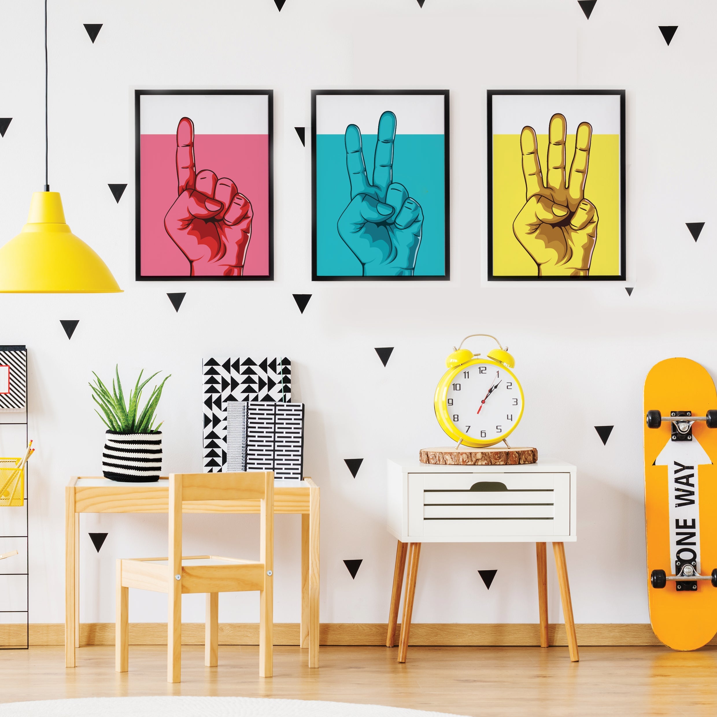 The last poster in golden yellow shows a hand with three fingers raised, which can symbolize different messages, including solidarity or success. The color yellow is associated with optimism and energy, providing positive vibes to any space.
