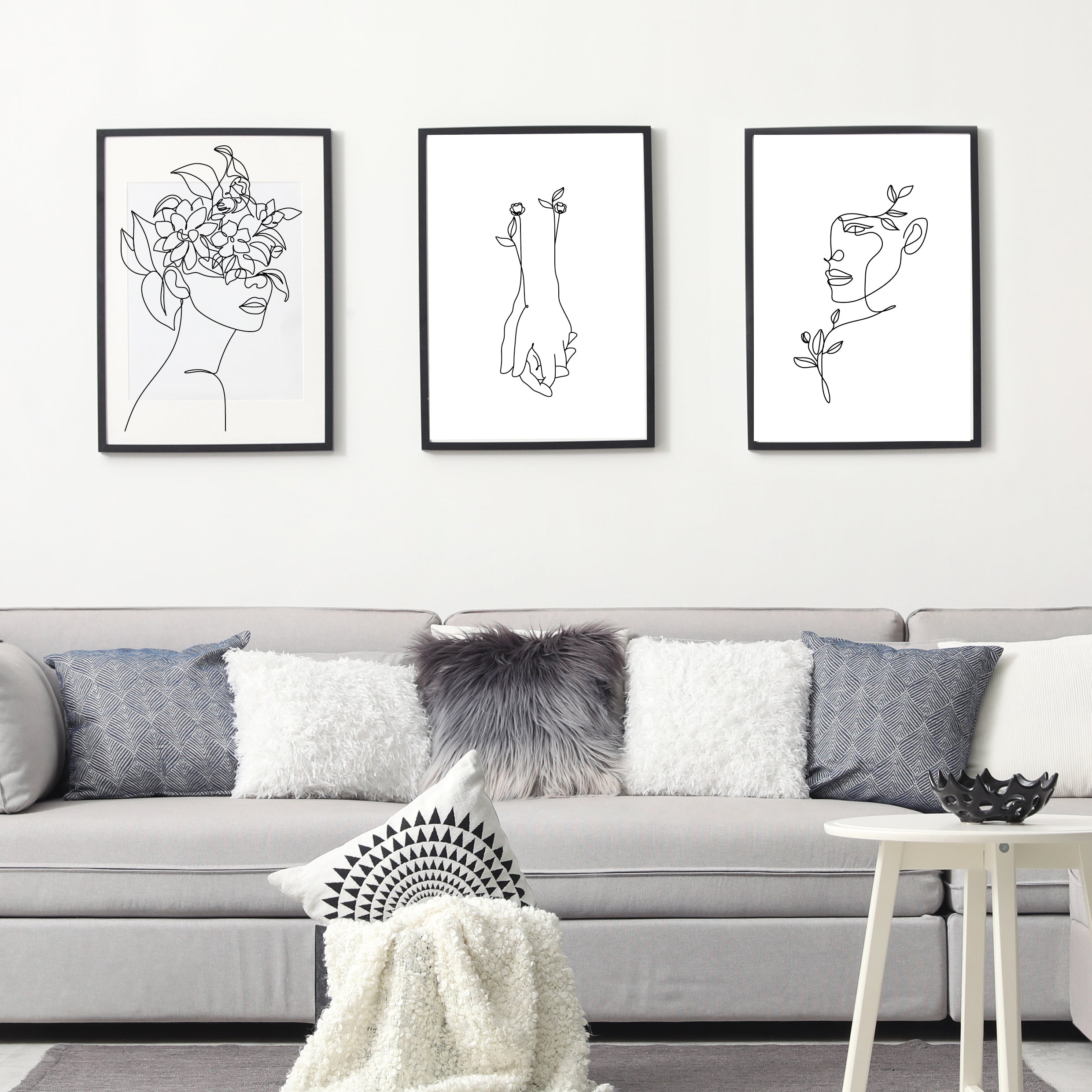 The “Hand in Hand” poster set explores human connection and nature through a minimalist line and clarity of form. In three interconnected posters, each shows different aspects of humanity and naturalness: from a face enveloped in flowers symbolizing growth and beauty, to intertwined hands representing unity and strength, to a profile of a face surrounded by leaves suggesting introspection and peace. Each poster exudes the elegance of black lines on a white canvas, emphasizing the subtlety and power of simplicity. This artistic trio is perfect for adding a sophisticated and modern touch to any space, promoting thought-provoking art and a sense of community.
