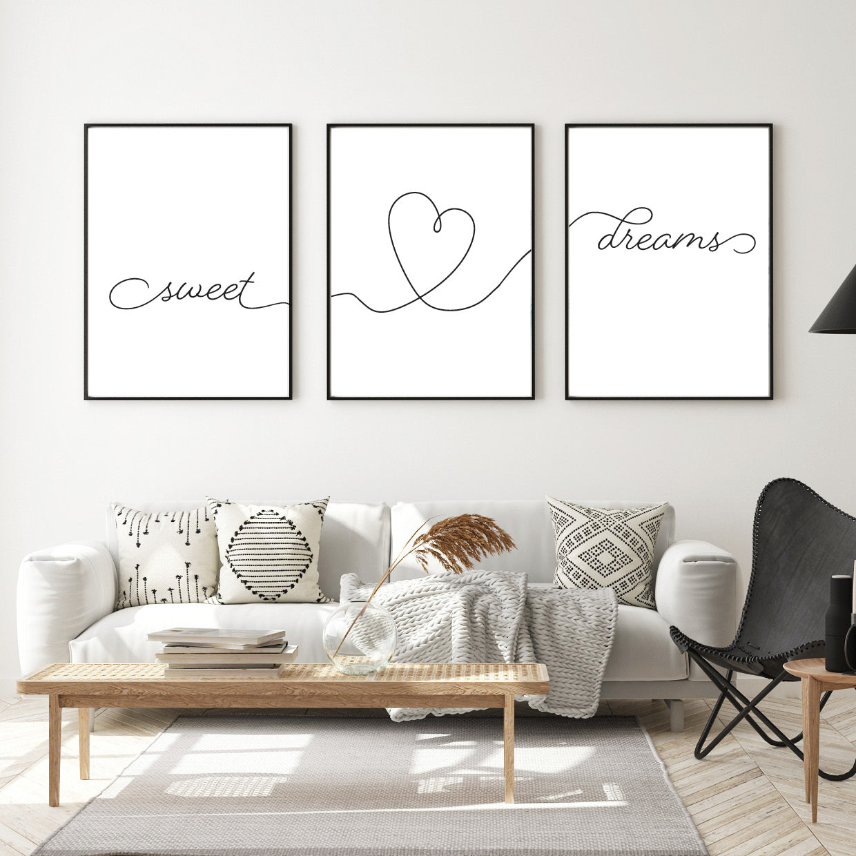 The “Sweet Dreams” poster set exudes minimalist elegance and loveliness, perfect for creating an atmosphere of peace and tenderness in your home. Each of the three posters contains one word – “sweet”, “love”, and “dreams” – which are stylized in fluid lines, creating an artistic play and a symbolic whole. The heart that is formed from a single line in the central poster symbolizes love, and the elegant endings of the letters emphasize the fluidity and strength of feelings. This poster set is the perfect addition to bedrooms or other intimate corners where peace and tranquility should prevail. Its reduced black and white color palette allows it to easily fit into different interiors and decoration styles, making it an ideal choice for those looking for subtle wall decoration.