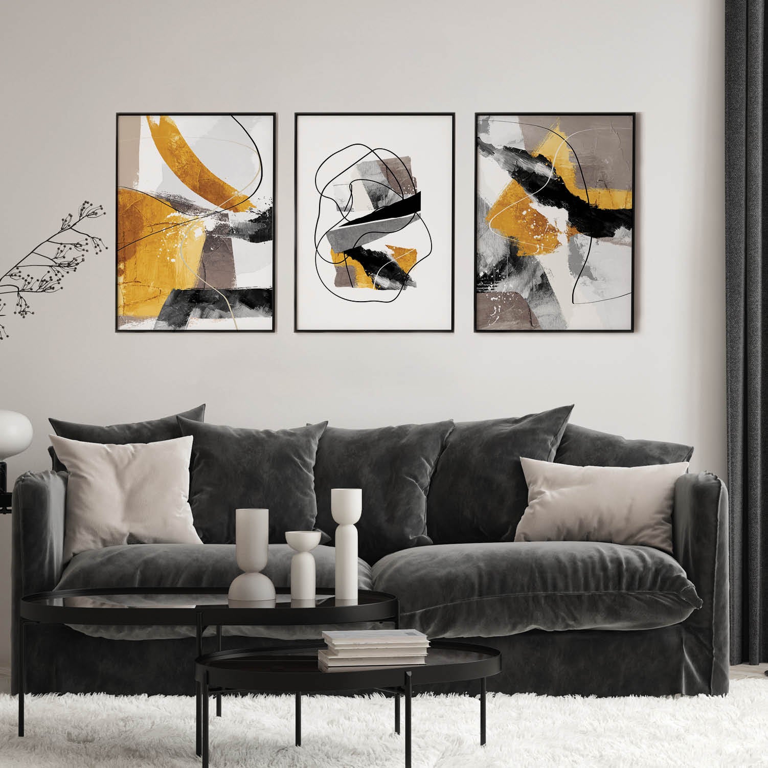 The first and third posters play with fluid lines and broad brush strokes, while the central poster focuses on more intricate shapes and lines that interweave, creating a unique focal point in the set. Golden-yellow surfaces add a sense of luxury and elegance, while black and gray create contrast and depth, making each poster particularly dynamic.