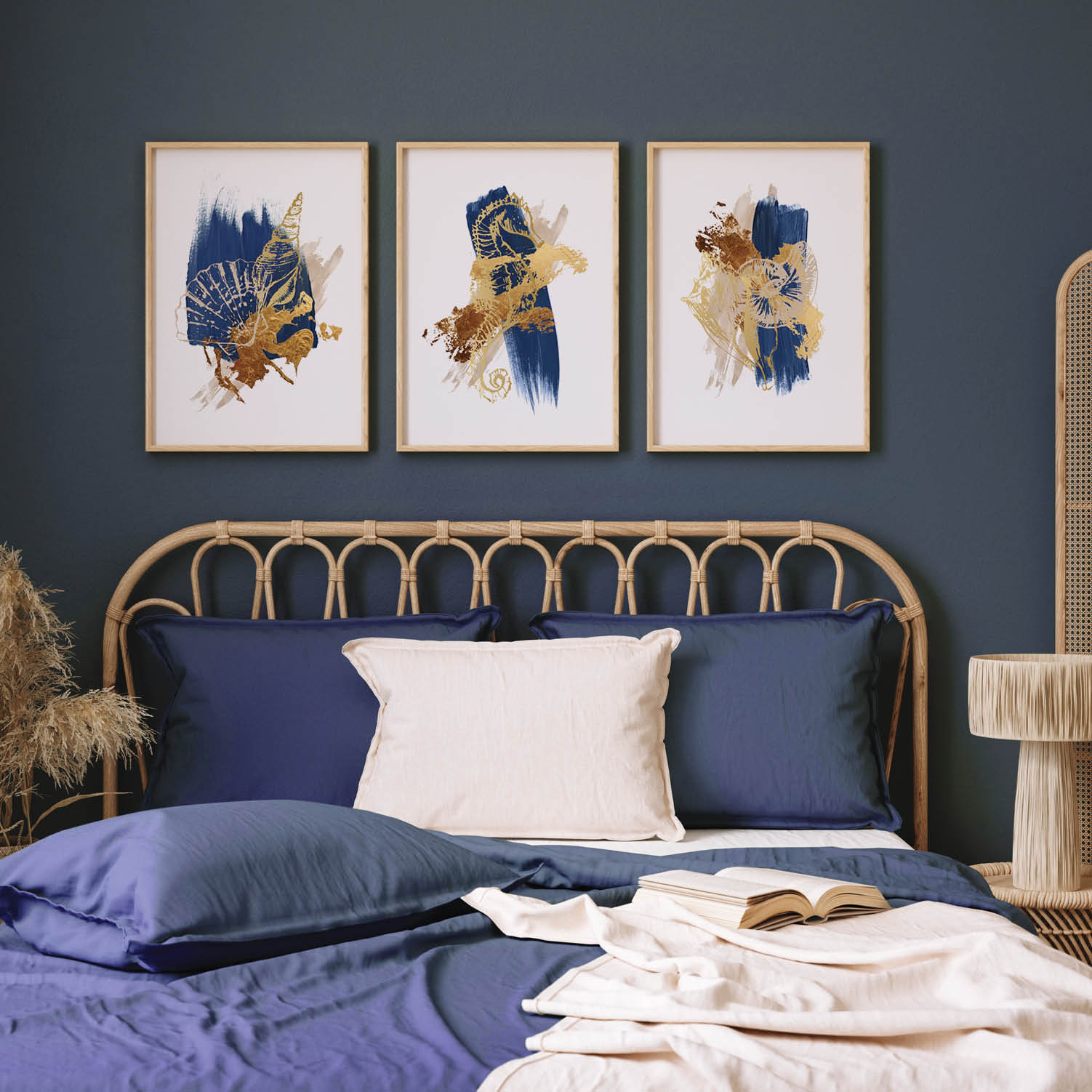 The first poster shows an abstract shell shape decorated with blue and gold elements, which creates a feeling of opulence and an ancient connection with the seas. The central poster explores the texture and form of the starfish, combining golden hues with deep blues, symbolizing its noble and almost imperial nature. The third poster in the series uses a similar color palette to depict another marine motif, which could be interpreted as a type of sea leaf or seaweed, emphasizing its delicacy and fluidity.