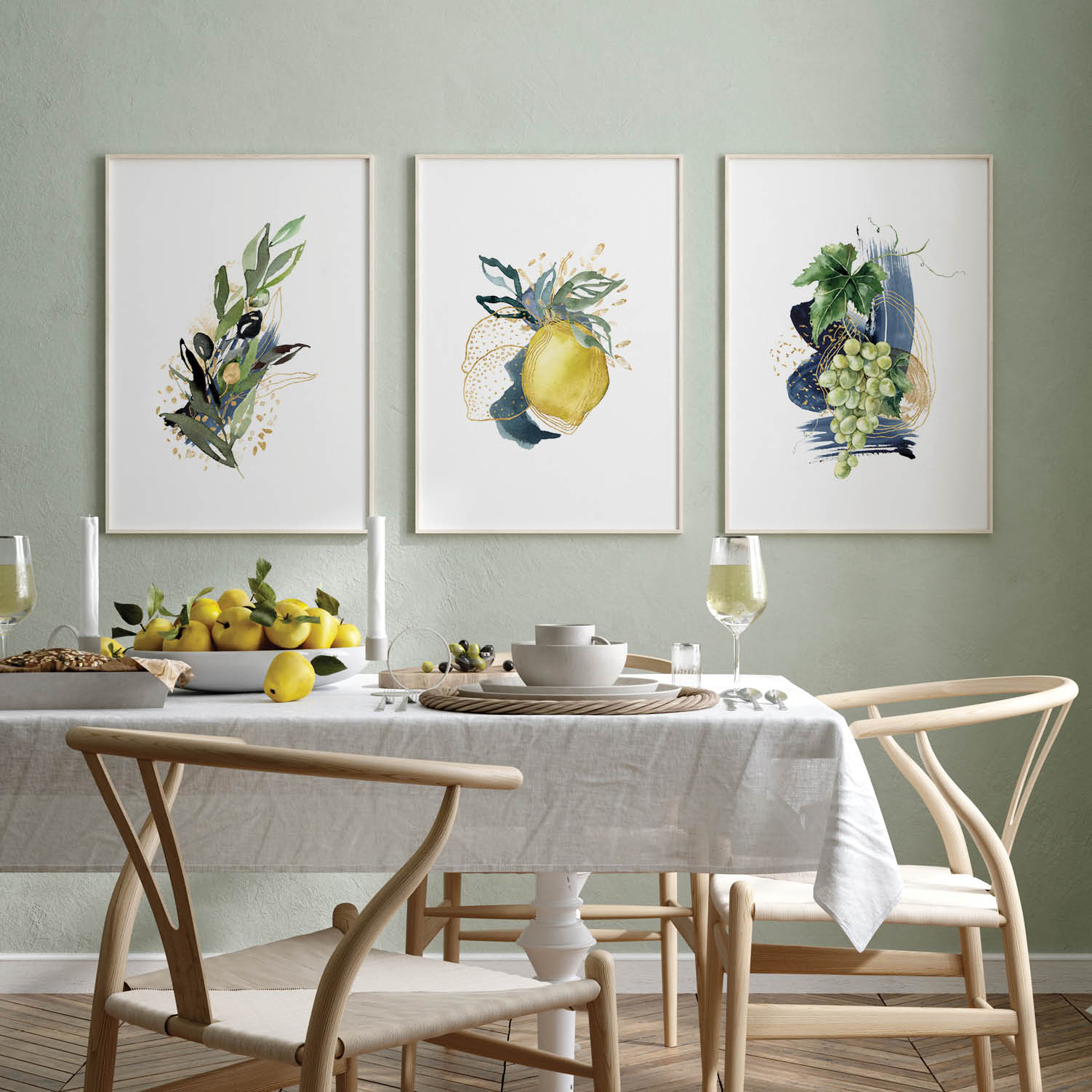 The first poster shows olive branches, recognizable by their shiny, dark leaves and fruits, set among delicate, golden splashes that add the impression of sunlight reflecting off the olive leaves. The central poster stands out with a vibrant depiction of a lemon surrounded by greenery and floral strokes, symbolizing wealth and abundance, while the third poster presents bunches of green grapes, illuminated with details that evoke freshness and natural sweetness.