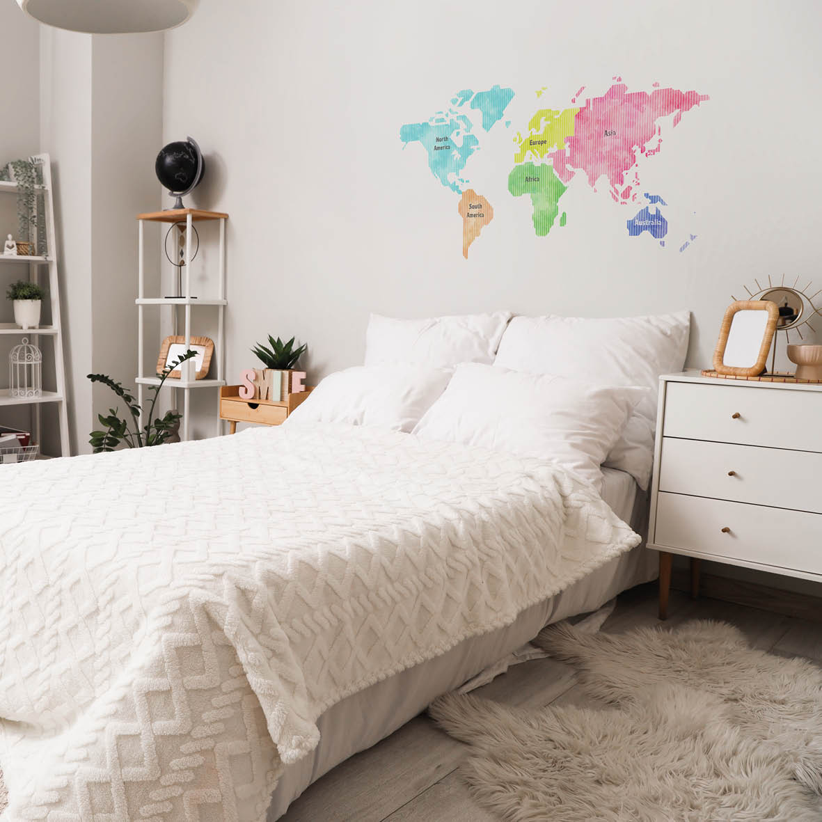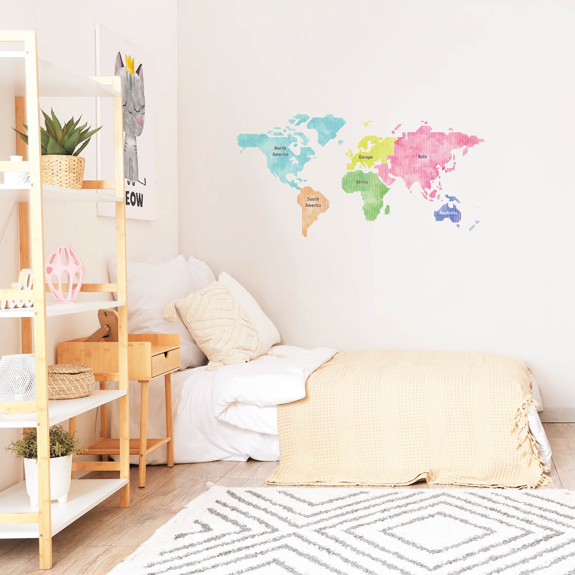 Inspire little explorers with colourful watercolor world map decals. Textile wall stickers are removable, durable, and safe for daily use.