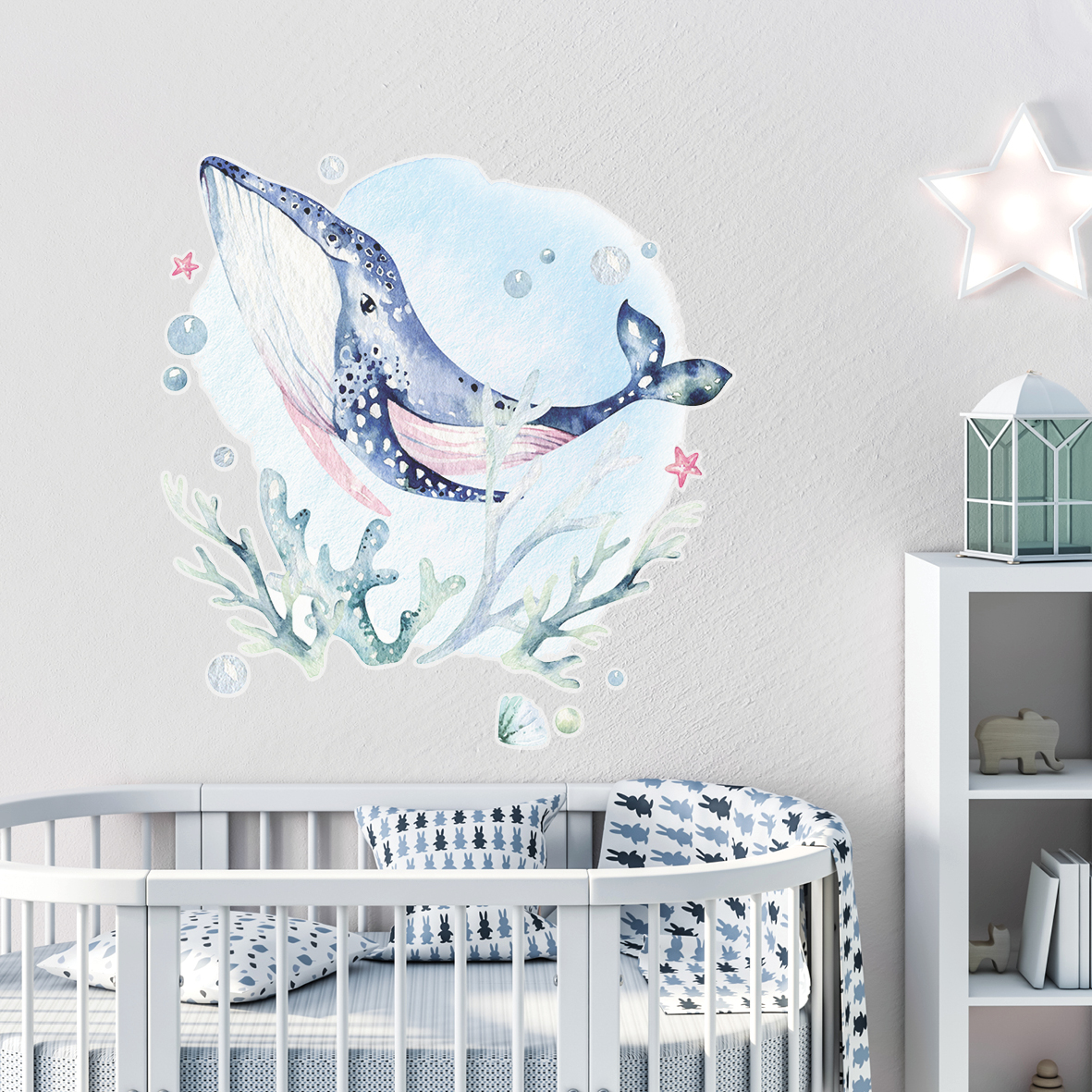 Celebrate the sea with whale decals in playful colours. Textile material is safe, removable, and styled quickly for nurseries.